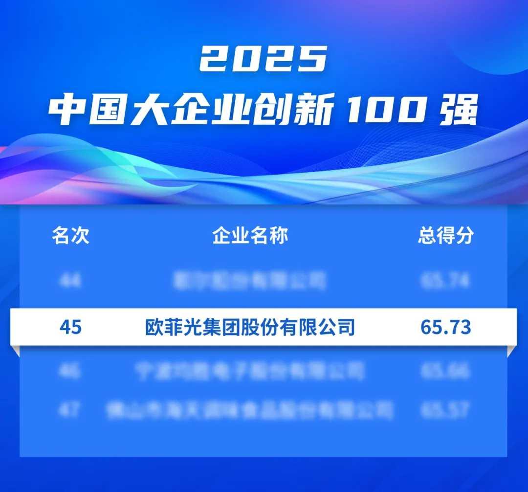 近日,中国企业联合会、中国企业家协会正式发布“2025中国大企业创新100强”名单。欧菲光集团股份有限公司凭借出色的技术创新能力、持续的研发投入和丰富的专利成果,以综合得分65.73分位列榜单第45位中期国际,彰显了企业在创新领域的强劲实力。